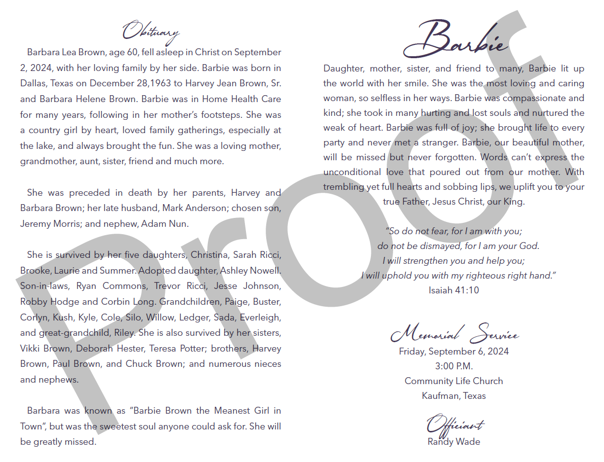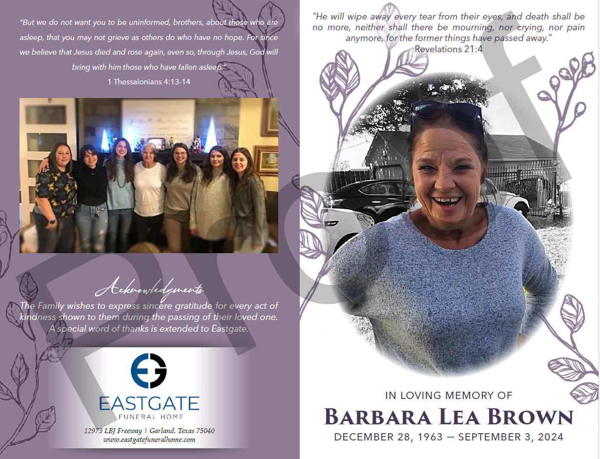 Barbara Lea Brown age 60 fell asleep in Christ on September 2, 2024, with her loving family by her sideBarbie was born in Dallas, TX on December 28,1963 to Harvey Jean Brown Sr. and Barbara Helene BrownBarbie was in Home Health Care for many years, following in her mother’s footsteps. She was a country girl by heart, loved family gatherings especially at the lake, and always brought the funShe was a loving mother, grandmother, aunt, sister, friend and much more