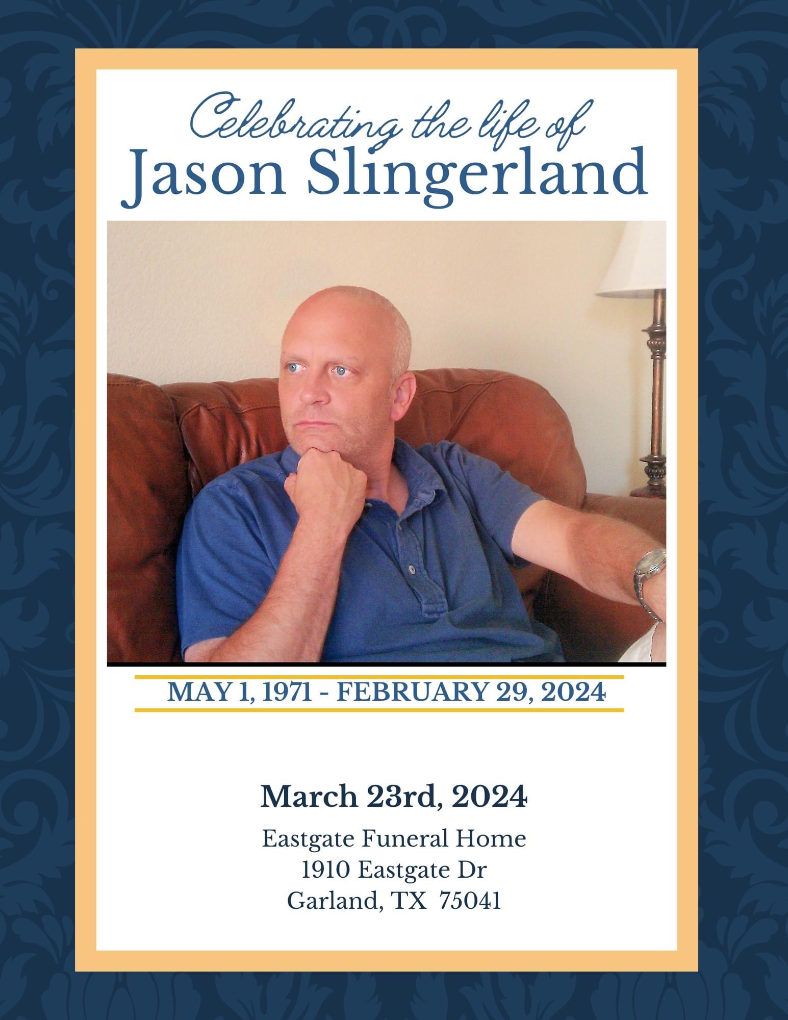 A memorial service to honor Jason's life will be held on Saturday, March 23rd at 12:00pm at Eastgate Funeral Home in Garland, Texas. His memory will be cherished by all who were lucky enough to know him.